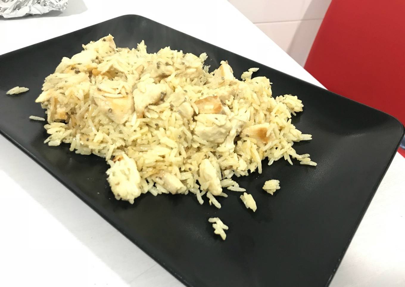 - Mezclamos con el arroz y echamos la nata. Condimentamos con pollo sazonador.Removemos y dejamos que se consuma un poco hasta que quede el espesor deseado.