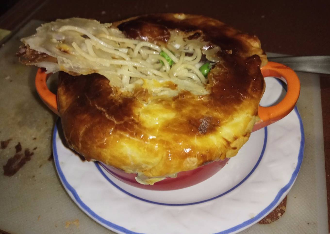 - Una vez todo listo, cogemos los recipientes donde vayamos a servir la comida. Los llenamos con la mezcla y tapamos con masa (bien de hojaldre o bien de empanadillas), pintamos con huevo batido y metemos al horno unos 5 o 6 minutos hasta que la masa crezca.