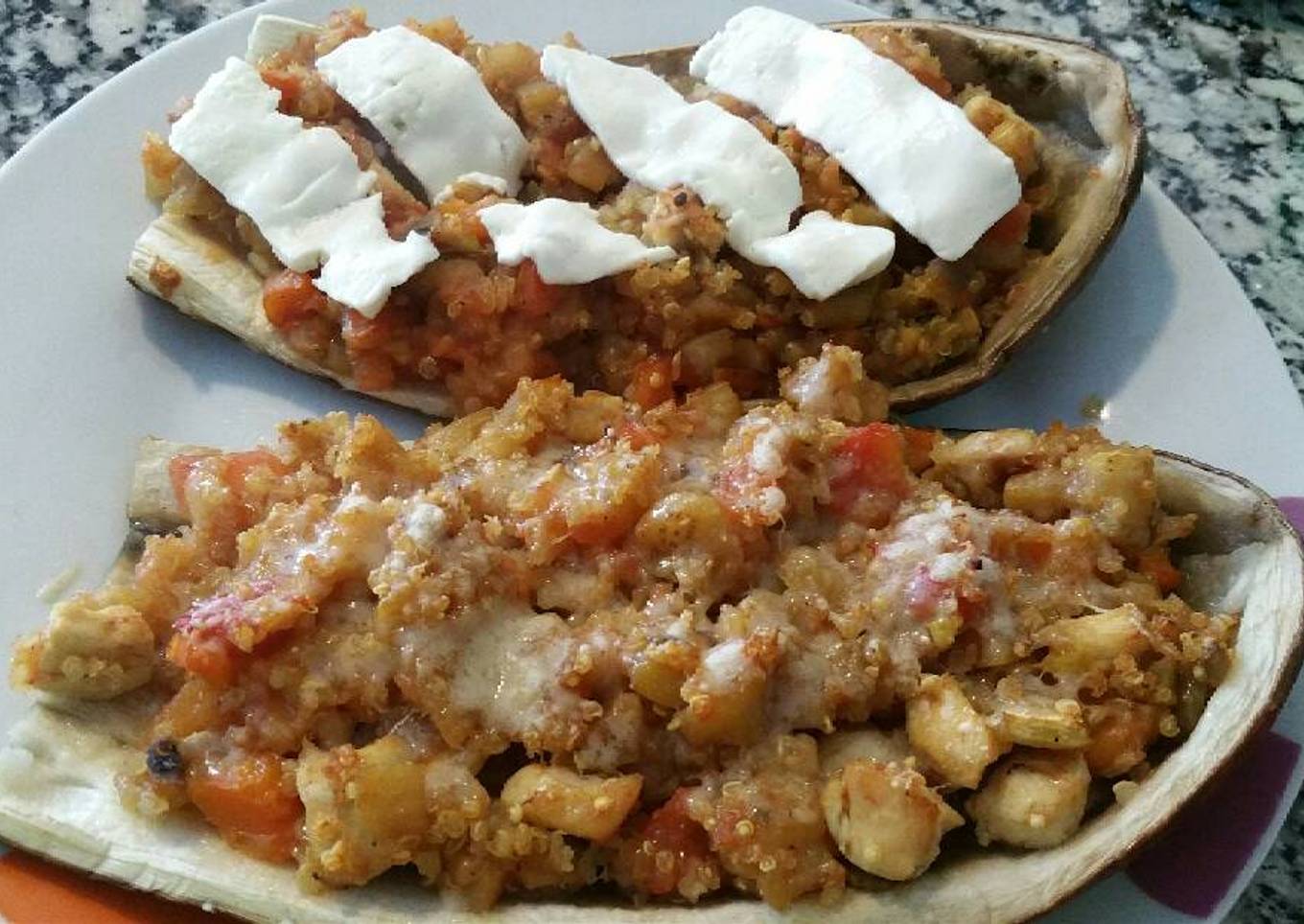 Instructions to make to make Berenjenas rellenas con pollo y quinoa