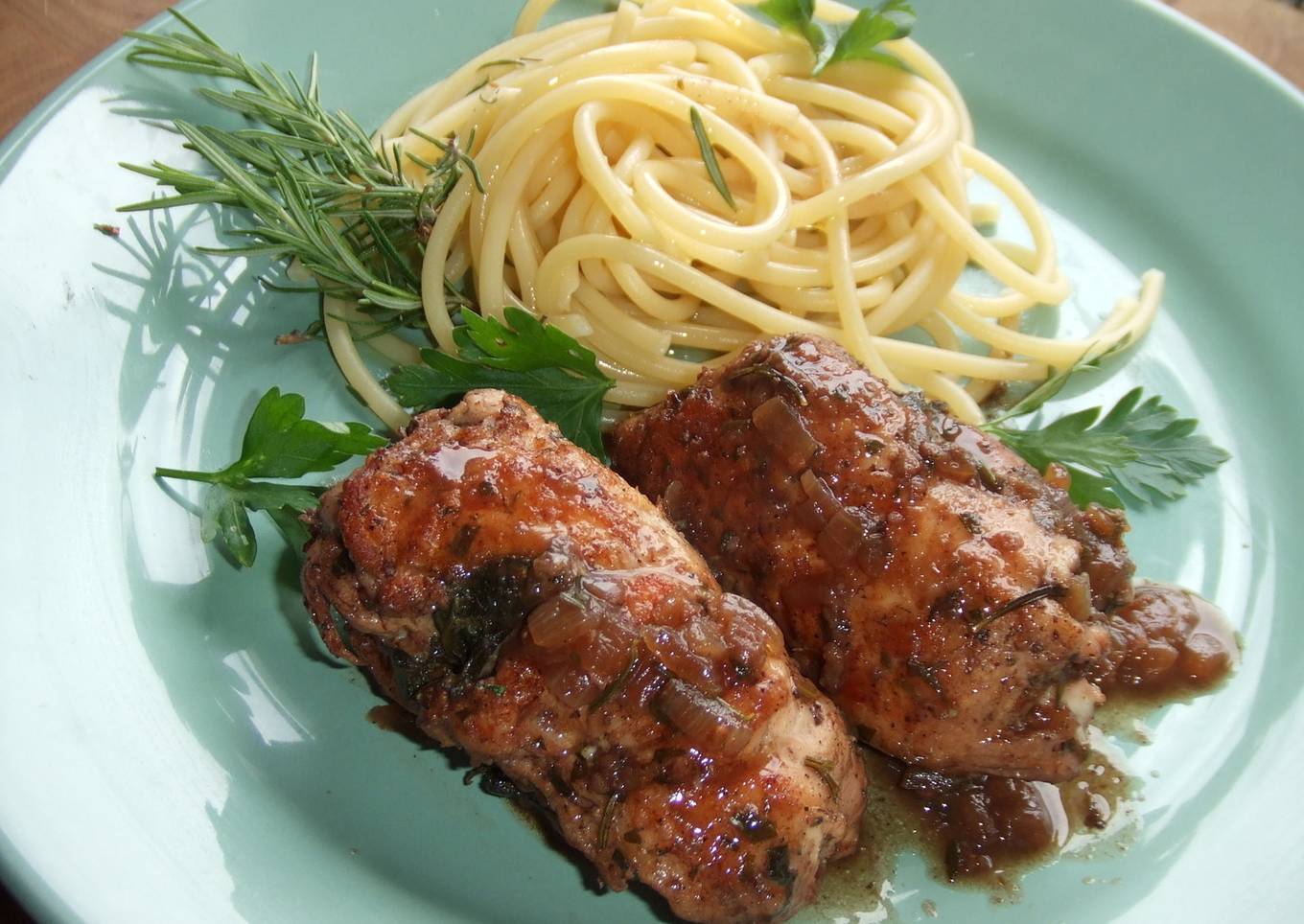 - Añadir un vasito de agua y cocer hasta que los rollitos estén tiernos. Cocer los bucatini en agua caliente con sal y servirlos con el pollo.