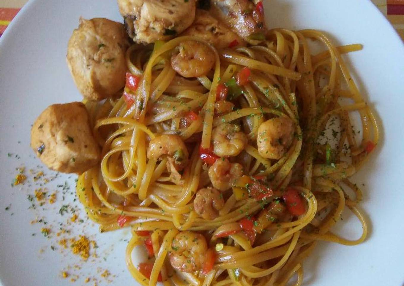 Con gambas y pollo, verduras y tallarines al dente...
