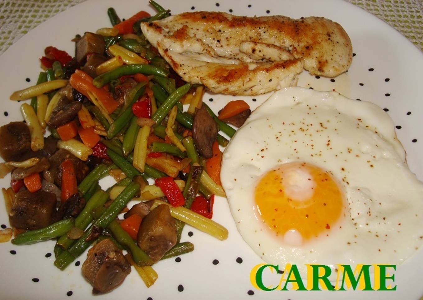 - Emplatar el salteado de verduras, con la pechuga de pollo y el huevo al lado. servir caliente.