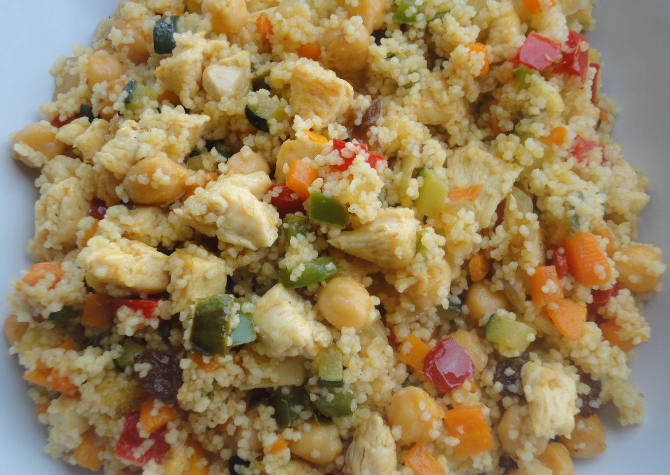 Ensalada de cous-cous con verduras, garbanzos, pollo, pasas y el toque exótico de las especias marroquís por excelencia.
