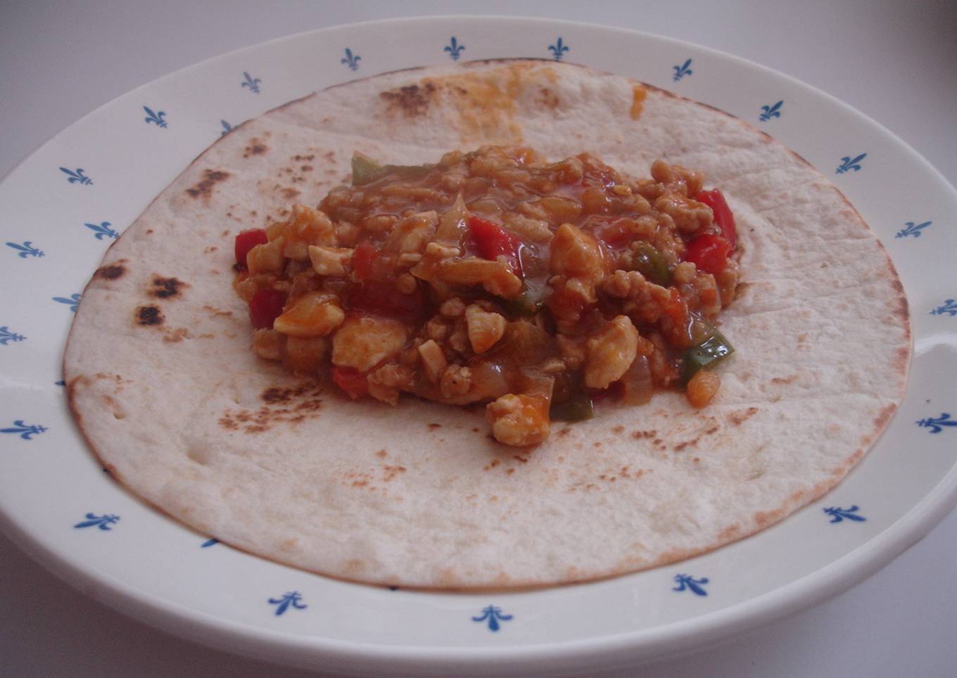 - Poner en un plato todos los ingredientes fritos en la sartén y en otro plato las tortillas de trigo ya pasadas por caliente.