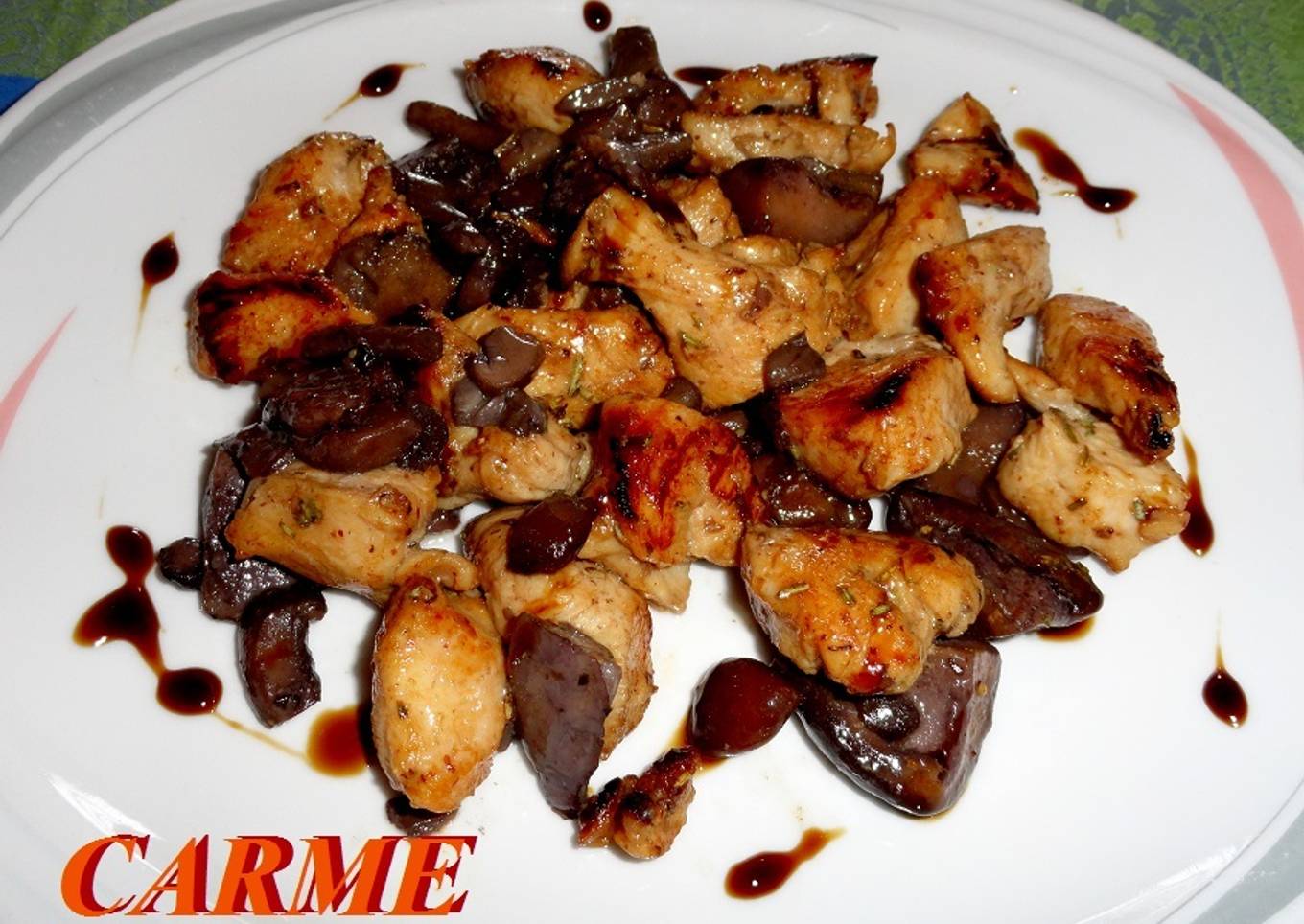 - Poner los tacos de pechuga en una sartén a fuego medio y asar poco a poco para que no se queme la reducción de vinagre. Mientras se pueden hacer las setas salteadas según costumbre.