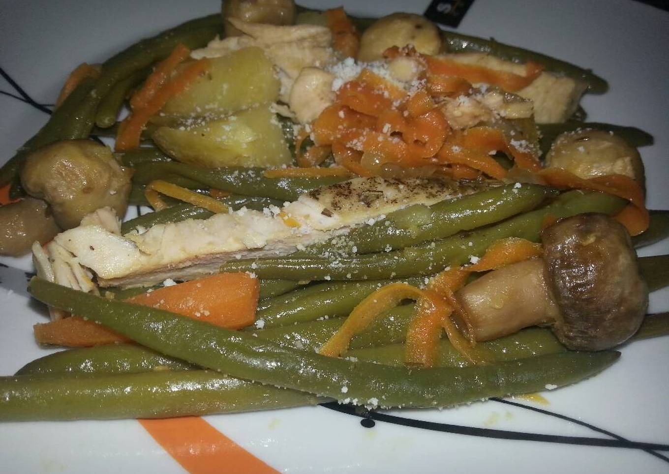 Para este plato utilicé pechuga de pollo asada y media patata cocida que me habían sobrado de días anteriores. Para los que decidimos comer un poquito más sano y deshacernos de los kilitos que nos dejo el verano esta idea de comer judías es genial.