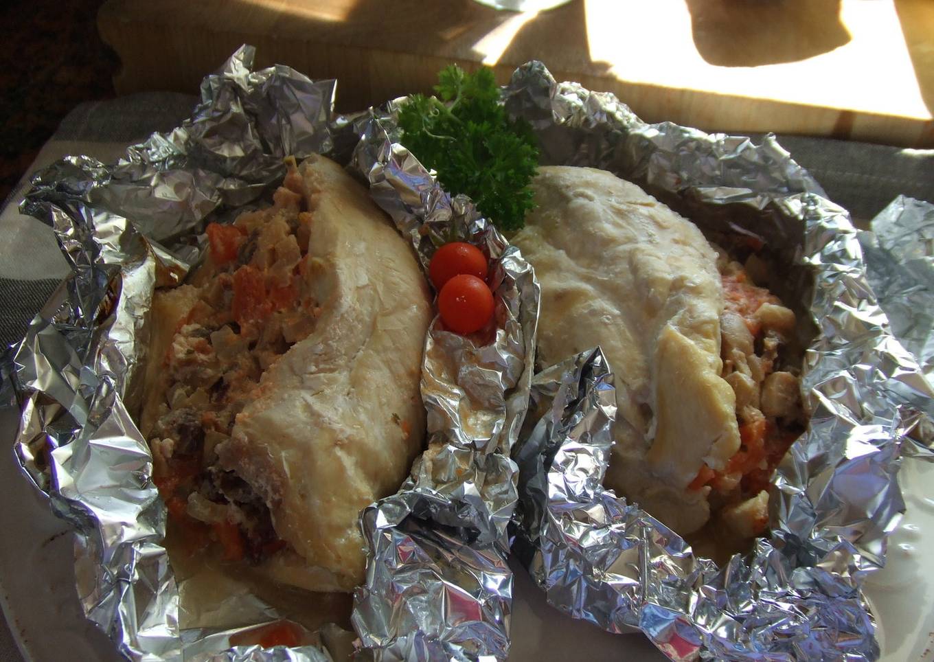 - Rellenar las pechugas con la preparación, rociarlas con un hilito de aceite de oliva, colocarles encima una ramita de romero y envolverlas en papel de horno o en aluminio.