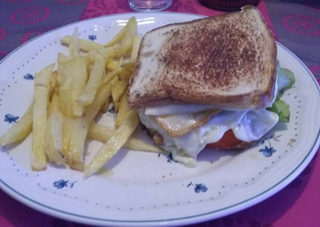 - Después de sacar el sándwich freÃmos un huevo (con una pizca de sal) y lo ponemos en el sándwich cerramos las tapas, pelamos y cortamos en tiras una patata y la freimos 5min con un poco de sal y a comer