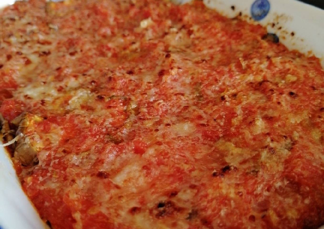 - En una fuente apta para el horno ponemos una base de tomate, una capa de berenjena, otra de tomate, berenjena... y terminamos con una de tomate