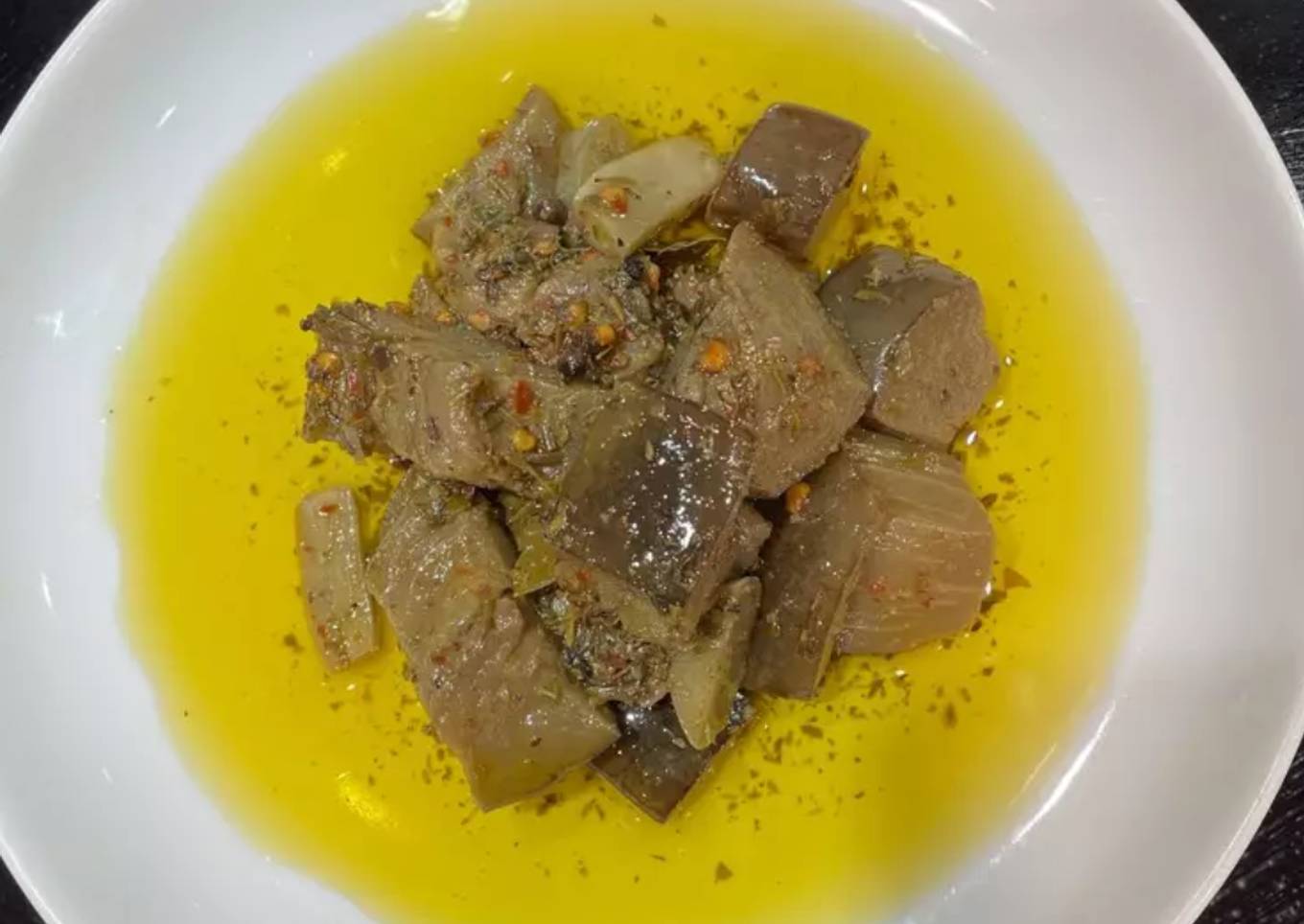 - Esterilizar un frasco grande de cristal donde quepa la mezcla, introducirla bien prieta contra las paredes y agregar aceite de manera que tape la mezcla tapar con la tapa de frasco también esterilizada y mantener varios días antes de consumir, controlando que siempre haya aceite por encima de las berenjenas.
