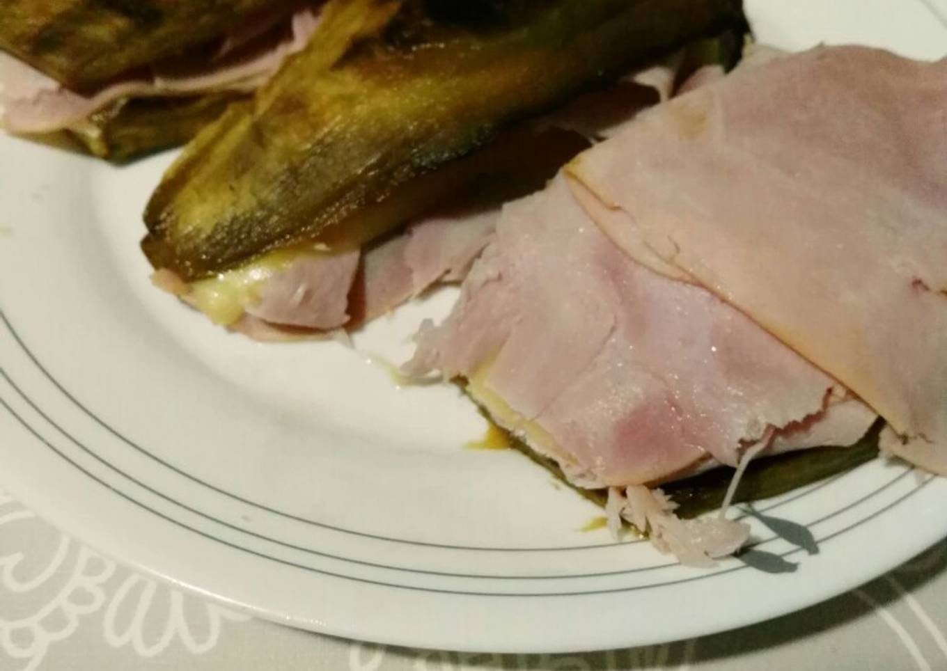 - Una vez hechas poner en una lámina de berenjena, el jamón y el queso al gusto y tapar con otra lámina.