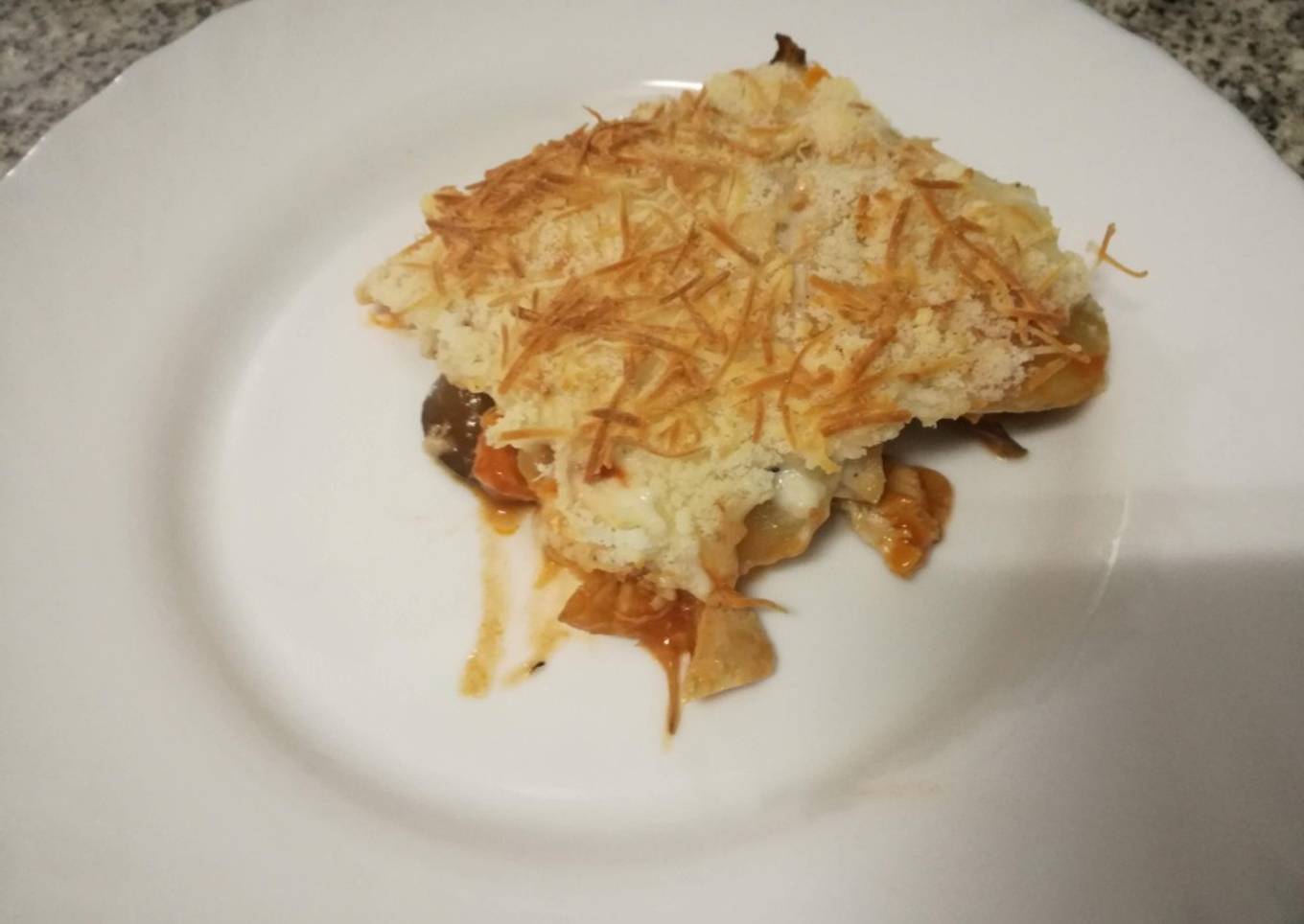 - Cubrimos la berenjena con la mitad de la salsa de tomate y ponemos encima el pollo cubriendo todo