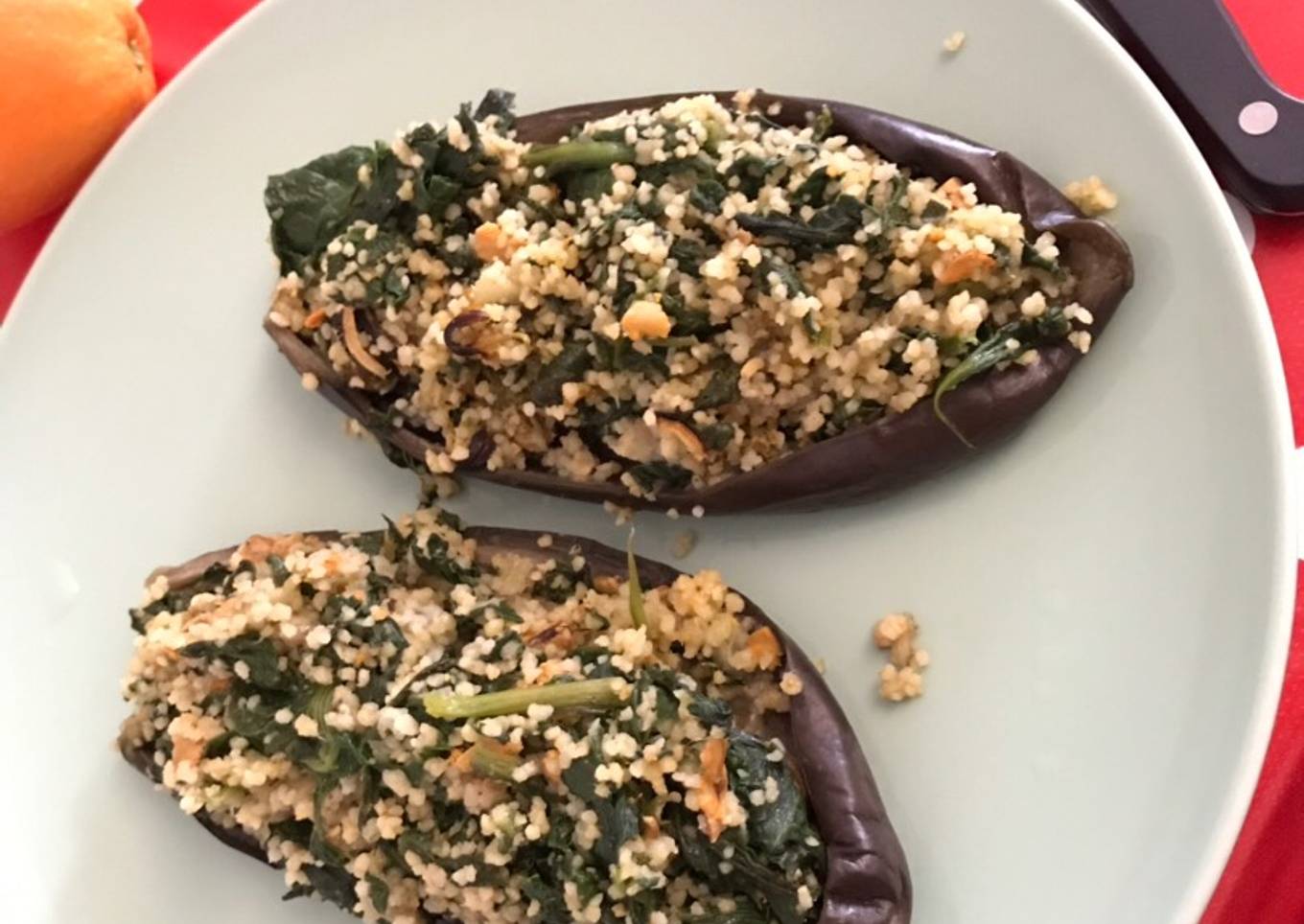 - Mientras se hierven las berenjenas. Coger 1/4 de couscous en un vaso y dejarlo en un recipiente. Esa misma medida cogerla de agua y llevarla a ebullición en el microondas. Cuando hierva echar en el recipiente del couscous y que se vaya hidratando.