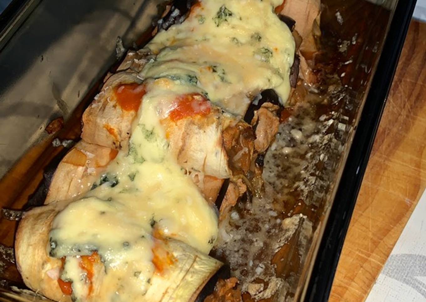 - Finalmente lo colocamos todo en una fuente apta para el horno, le añadimos unas cucharaditas de salsa de pimiento por encima al gusto y un poco de queso azul o cualquier otro queso de fundir.