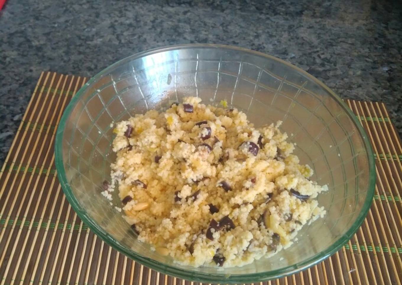 - Poner el cuscús donde se vaya a servir y añadir agua caliente y remover. añadir todos los ingredientes
