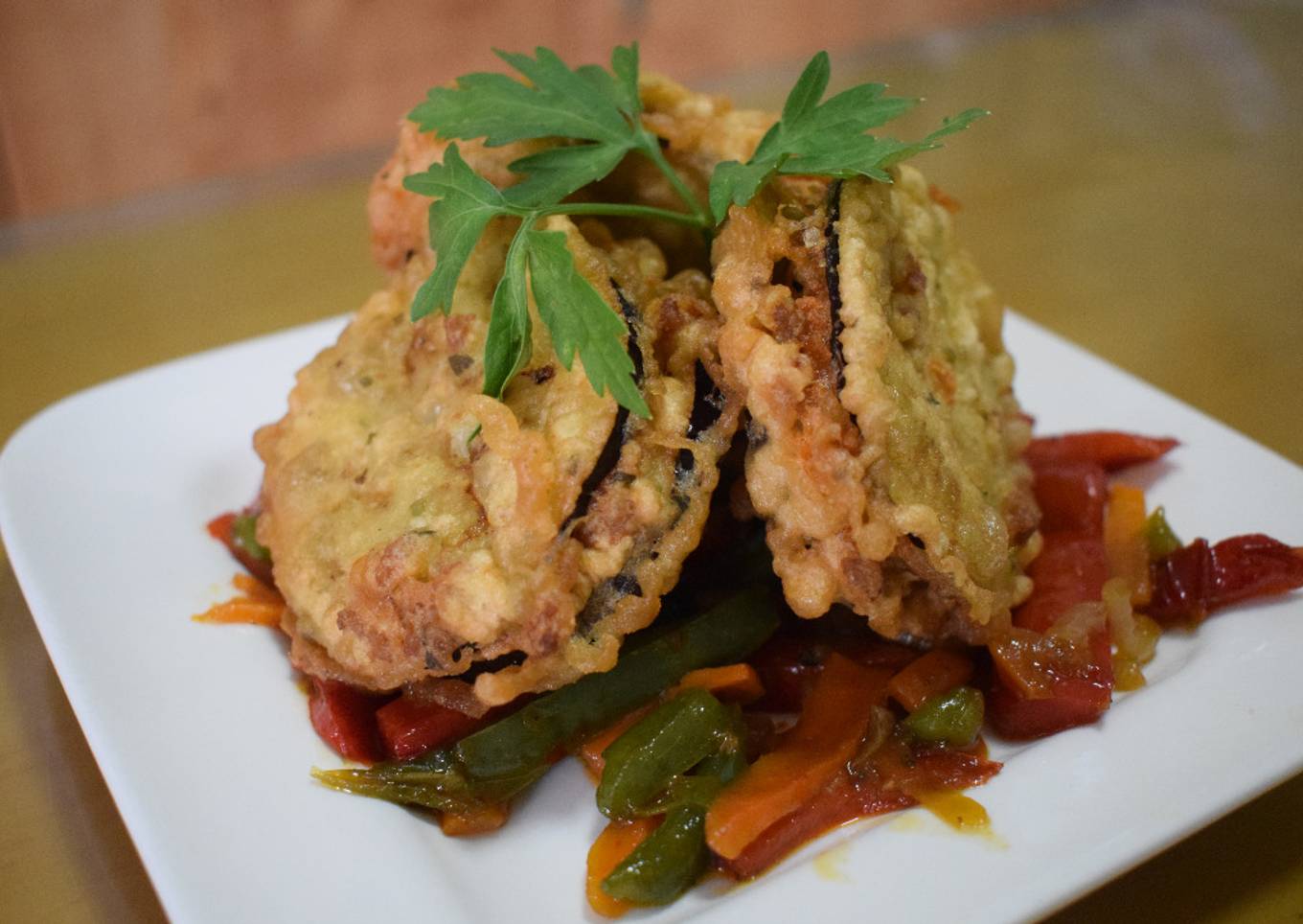- Una vez frita sacamos y en un plato ponemos el fondo con la verdura y colocamos las berenjenas como queráis.