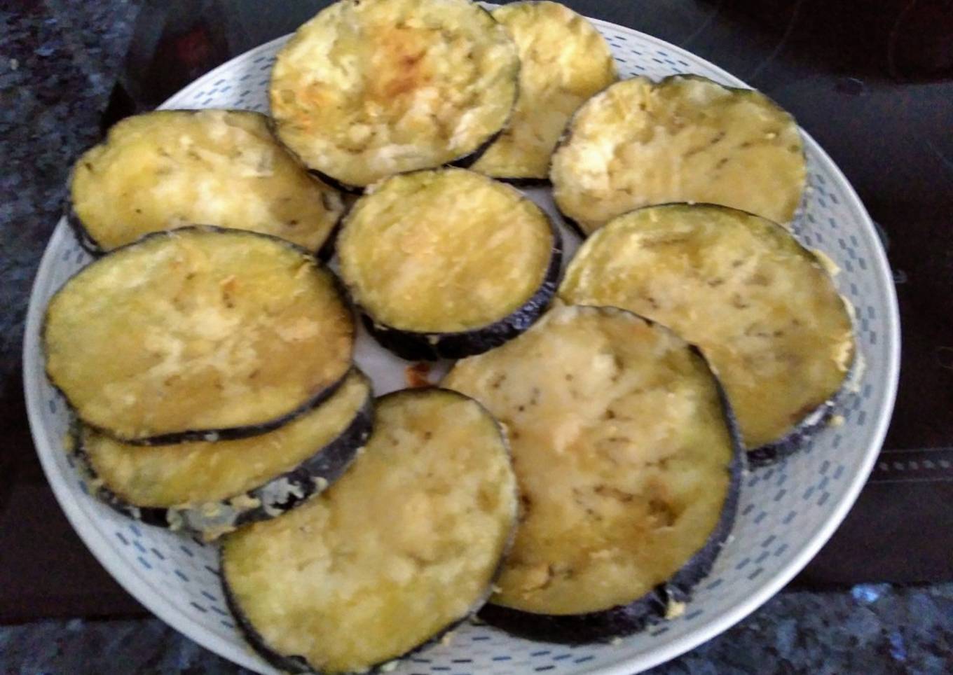 - Partimos la berenjena en rodajas, no muy gruesas.