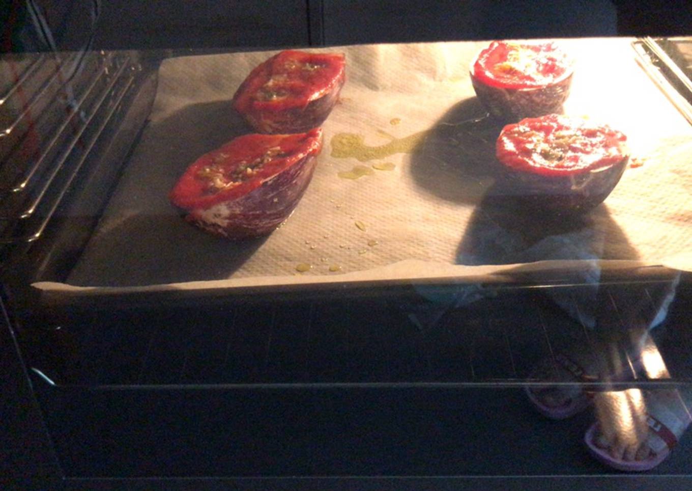 - Untamos las mitades de las berenjenas con el tomate natural y encima echamos nuestro majado. Acabamos con un poco de aceite de oliva también. Las metemos en el horno 50 minutos 200 grados.