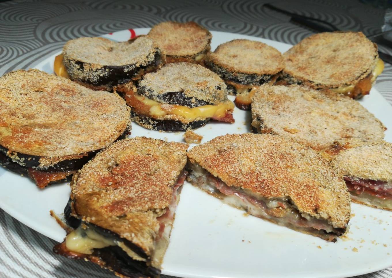 - Formar sándwiches de berenjenas con el jamón y el queso en loncha.