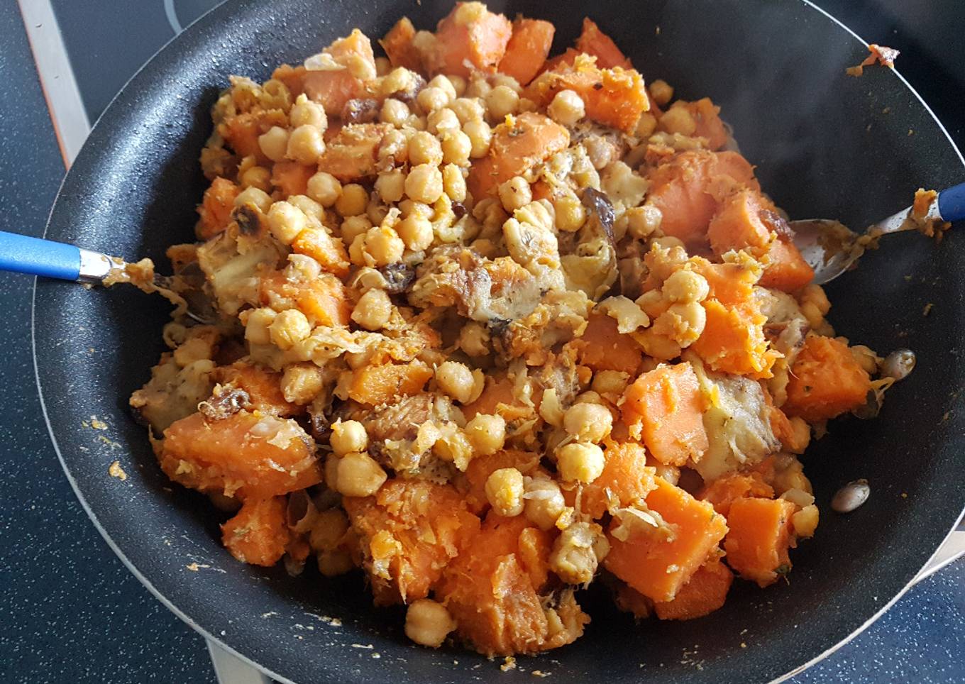 - Con muy poco aceite calentamos una sartén, añadimos los garbanzos cocidos, los boniatos cortados en cubos y la carne que hayamos sacado de la berenjena