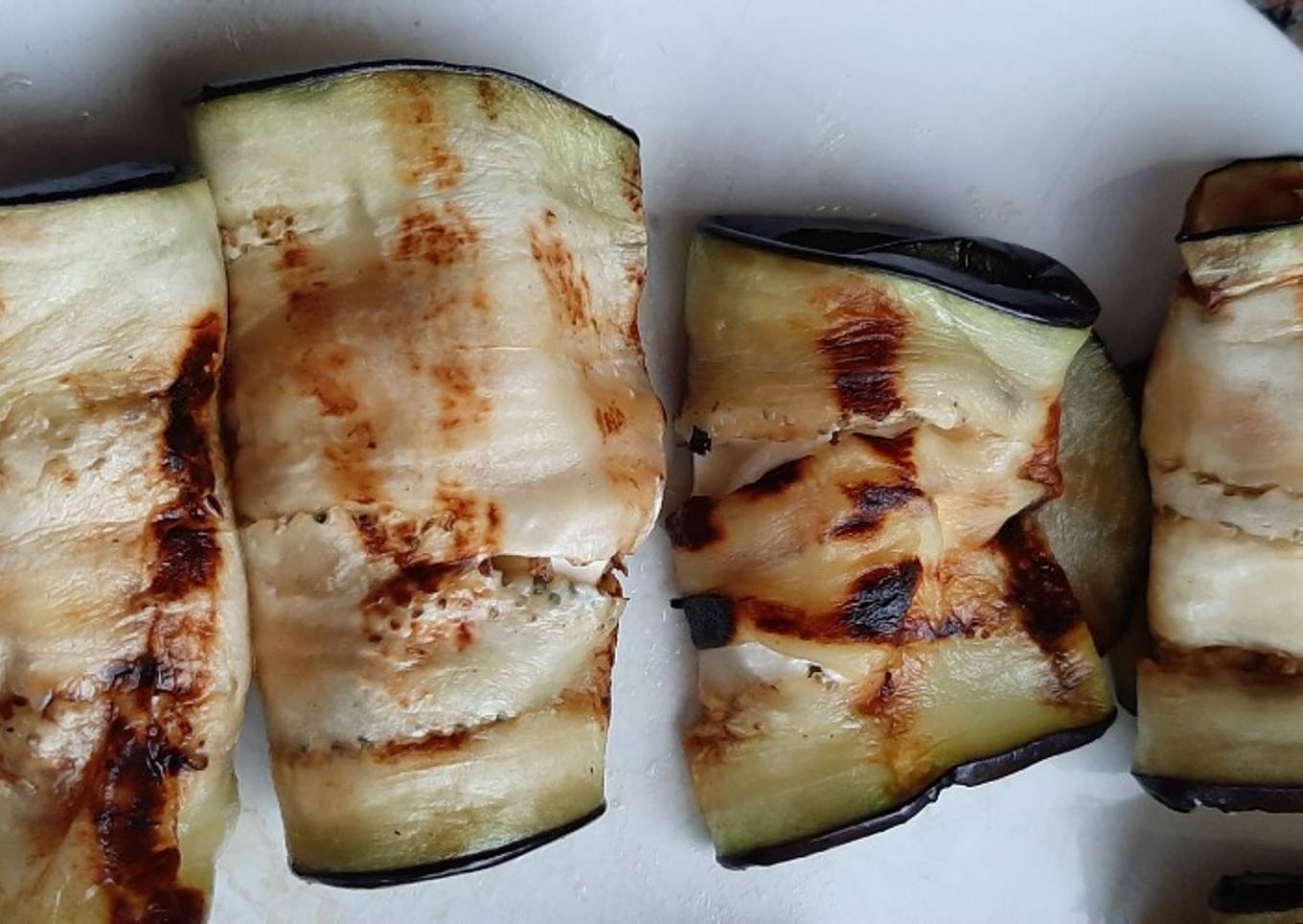 - Poner una rodaja de queso en cada tira de berenjena, ir haciendo rollito