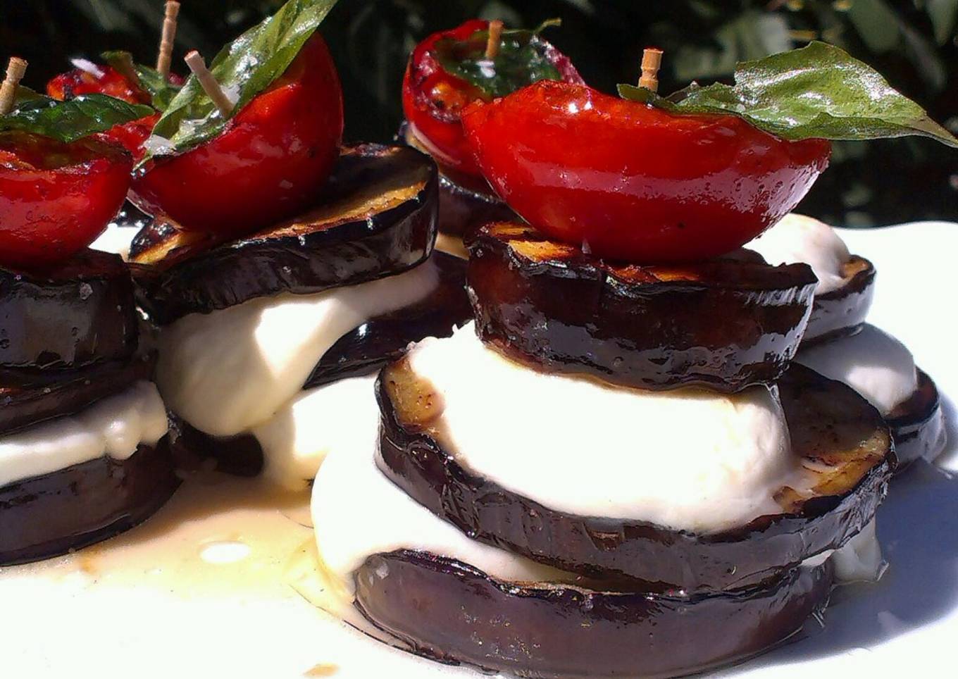 Otra versión del plato italiano, para servir de manera individual. Y más rápido de elaborar. Las cantidades son a ojo. Teniendo en cuenta poner 3 rodajas de berenjena y media cherry para cada pincho.