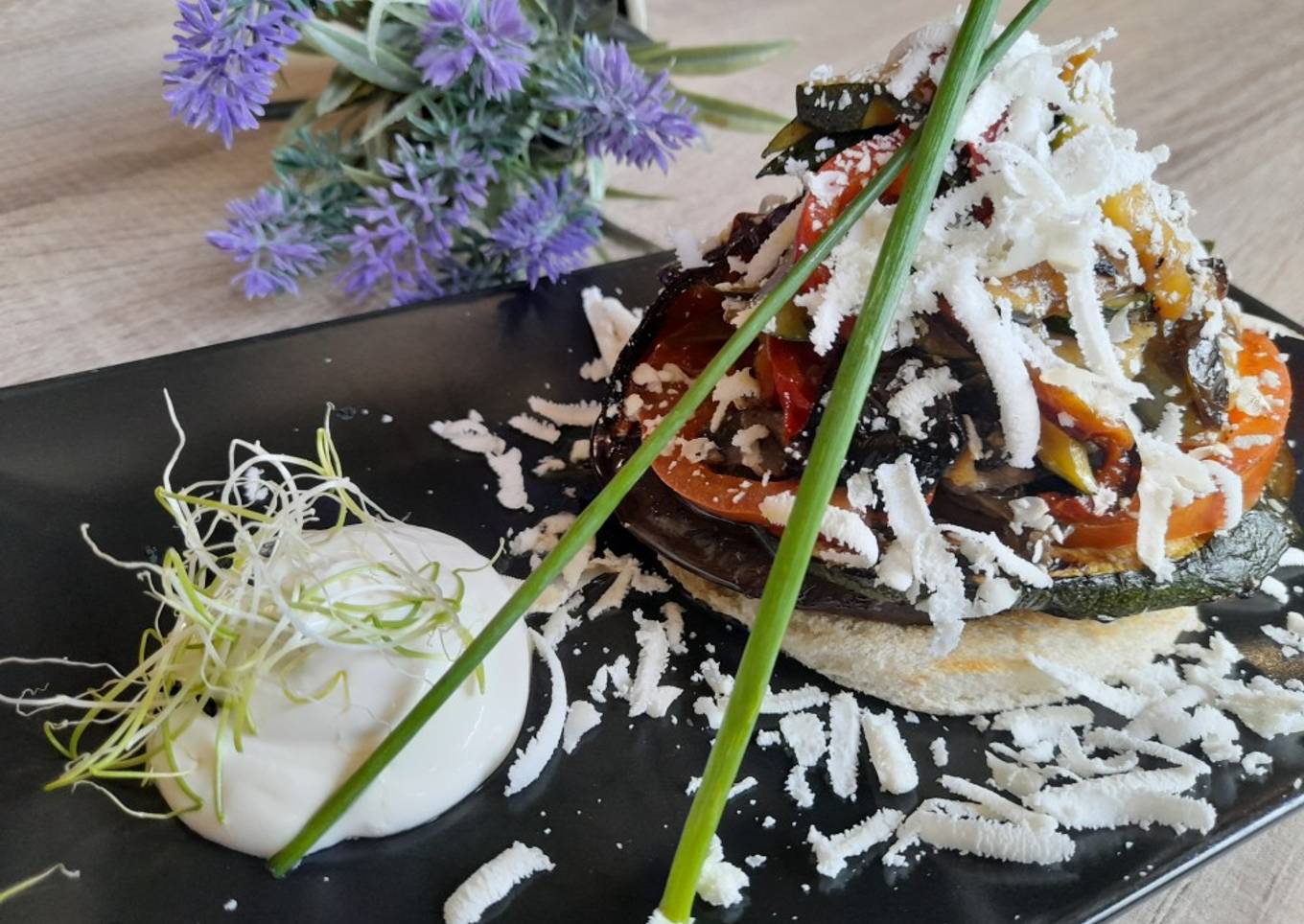 - Cortar un molde de pan y tostarlo y encima asemblar las verduras y rallar el caprino encima. Condimentar con sal, pimienta, aceite y albahaca, y decorar como en la foto con el queso Philadelphia y el germinados y el cebollino.