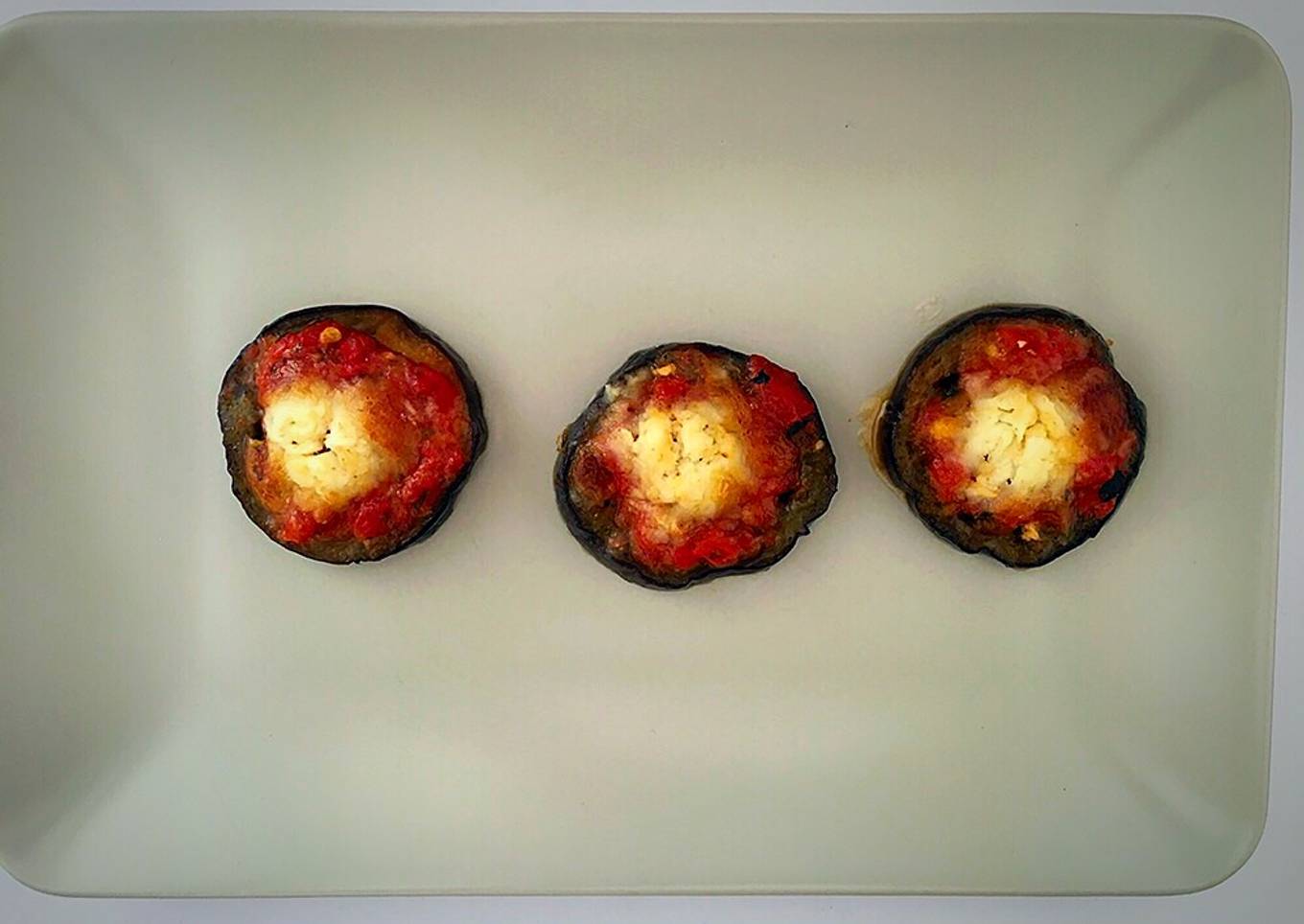 - Sobre cada rodaja de berenjena ponemos un poco de la salsa (que podemos triturar, si nos apetece)
