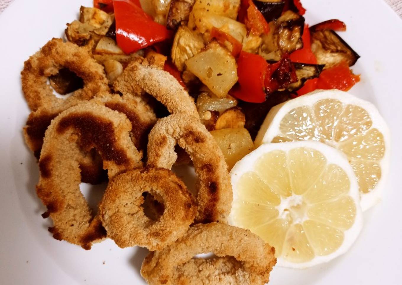 Calamares rebozados con verduras variadas 馃馃崊馃崑馃馃崋馃