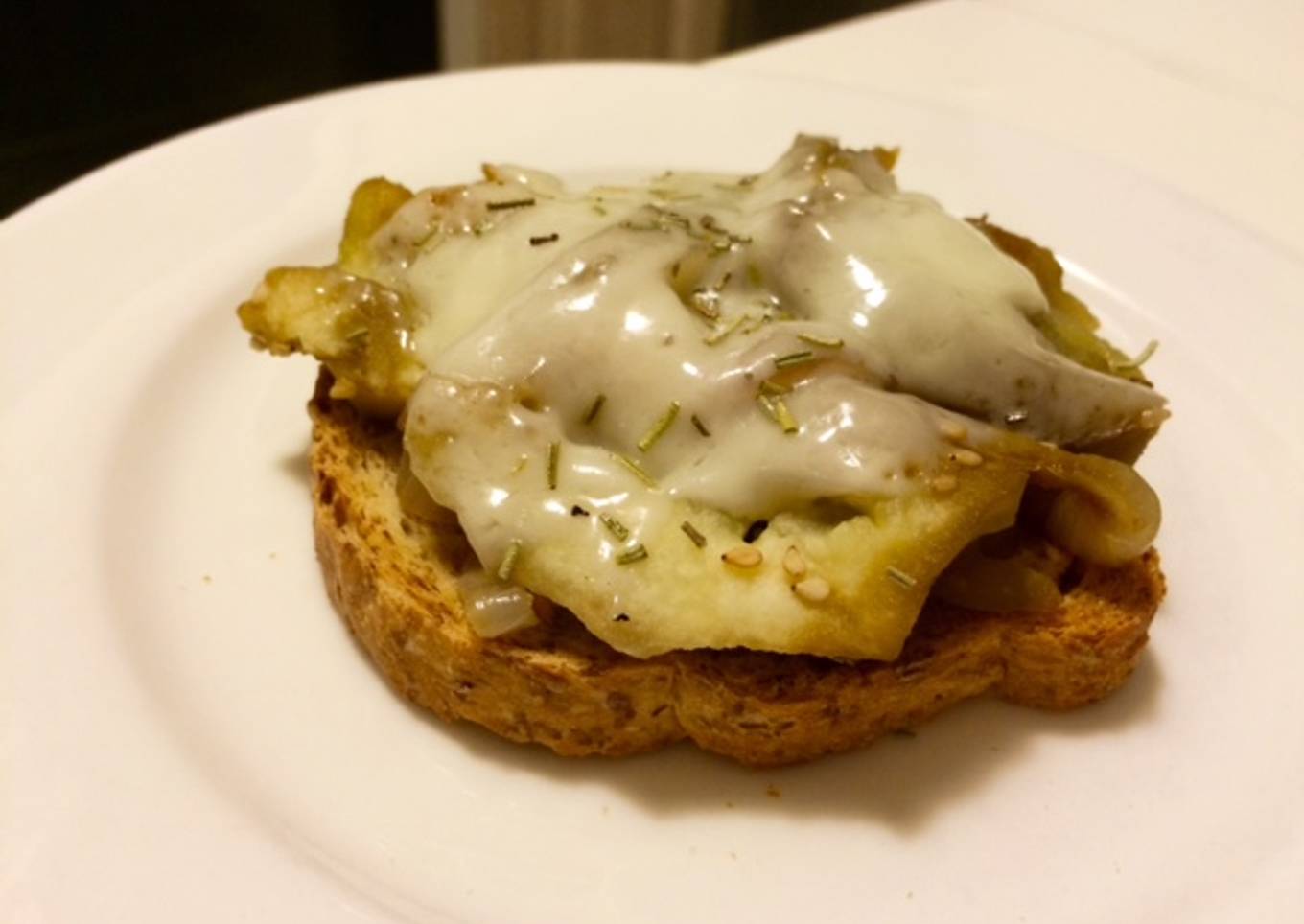 Tosta de pan integral con berenjena y cebolla caramelizada, todo con un toque de salsa de soja y gratinado al horno.