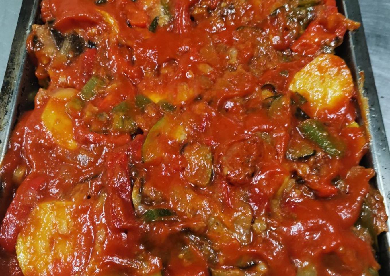 - Por otro lado cortamos toda las verduras a rodajas también y luego las freímos todo en una sartén con un poco de aceite y le echamos un poco de sal y pimienta dejamos que se cocinen, cuando esté casi echas las verduras le añadimos el tomate frito y terminamos de cocinarlo y después lo apartamos del fuego y empezamos a montar el plato en una bandeja.